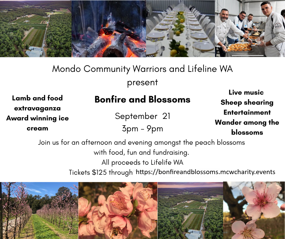 Join Mondo Community Warriors for ‘Bonfire and Blossoms’ a wonderful afternoon and evening in the Perth hills to raise money for Lifeline WA.